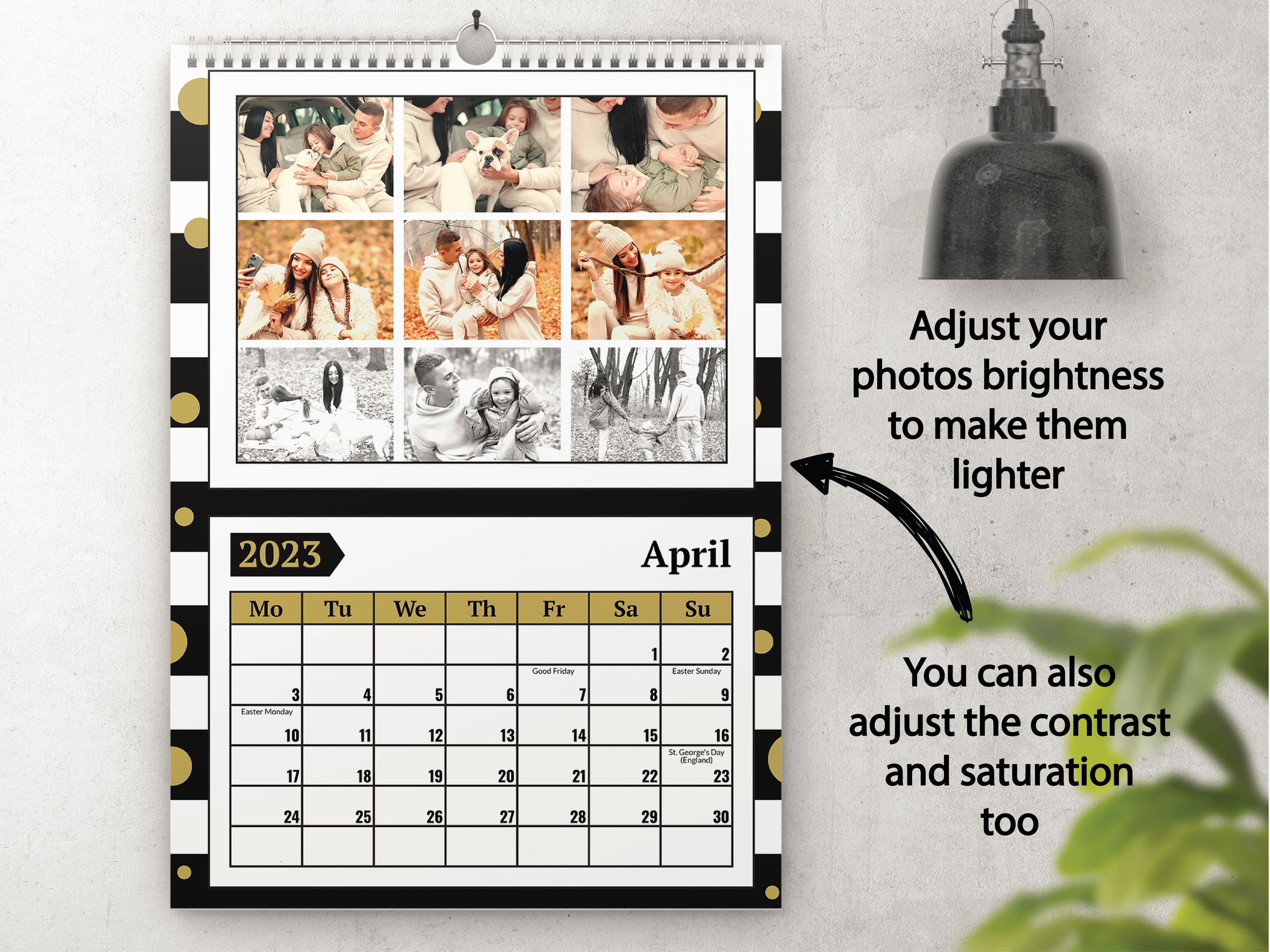 2. Step 2 – Choose the month and year for your calendar to start on, select UK or Polish holidays if needed, and customise each page with your photos. Add captions, select layouts, and apply filters if desired. Once satisfied, add it to your basket.
